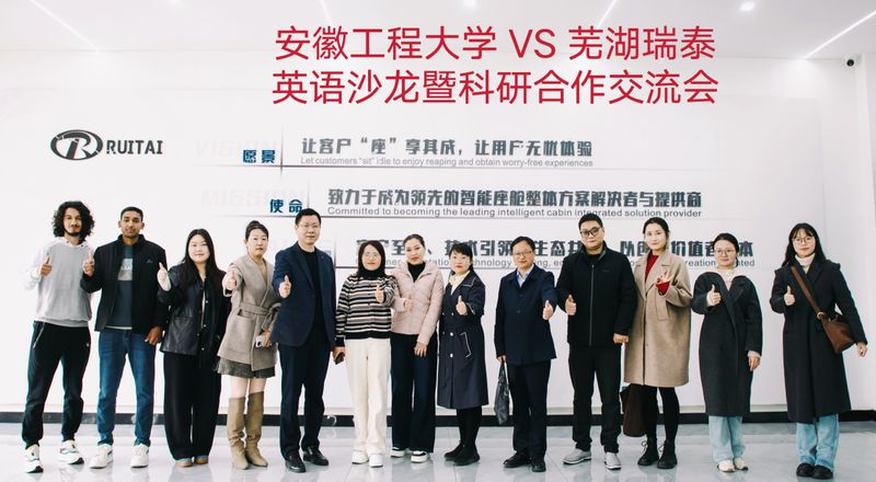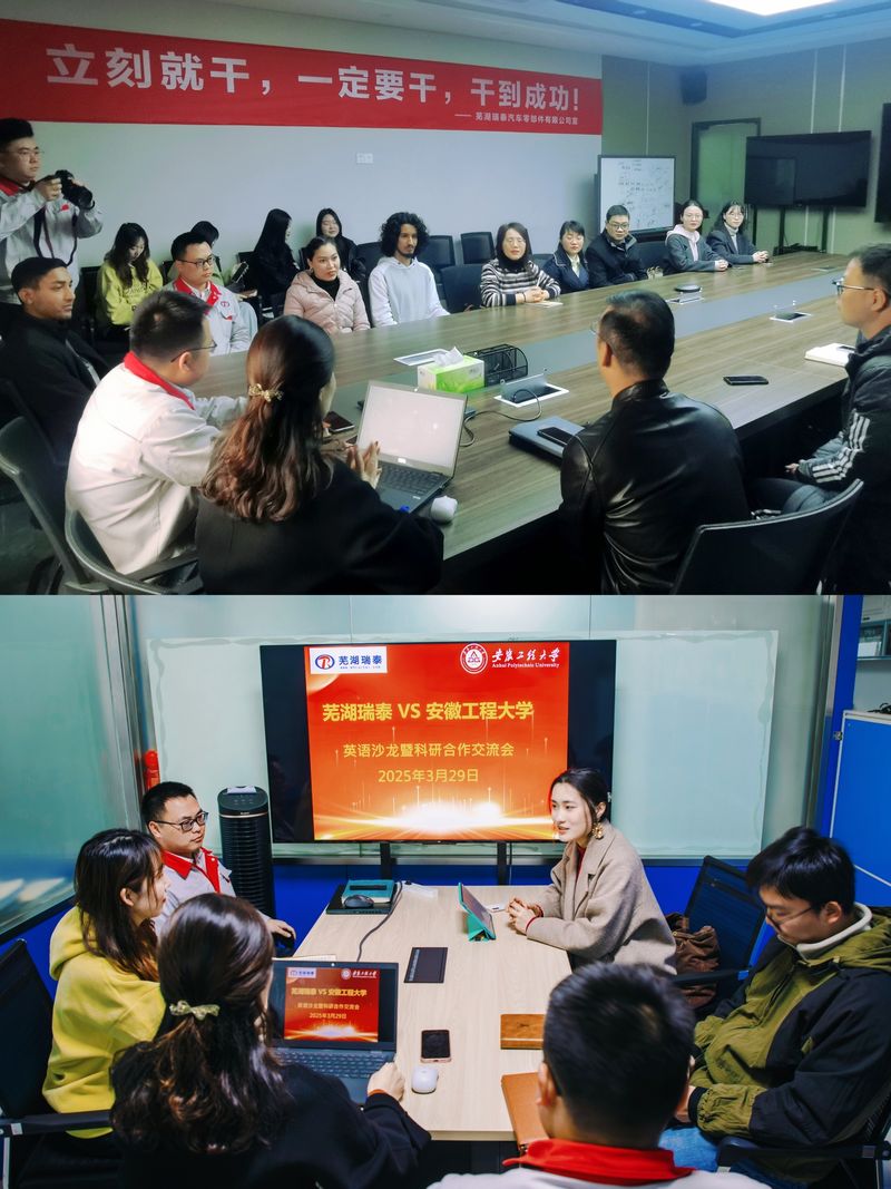 本网讯 3月29日,外国语学院与芜湖瑞泰汽车零部件有限公司联合举办的“英语沙龙暨校企科研合作交流会”在瑞泰公司成功举行。瑞泰公司董事长兼总经理刘春平、人力资源部部长朱媛媛、外国语学院副院长韩利敏、教师张兵和国际教育学院教师涂文婷出席了本次交流活动。活动以“语言赋能,创新驱动”为主题,汇聚高校研究生、留学生及企业代表近50人,通过语言文化交流与科研对话,深化校企合作新内涵,探索人才共育新模式。