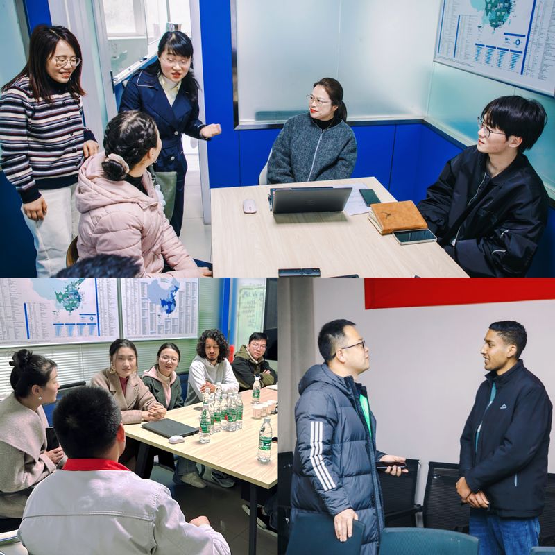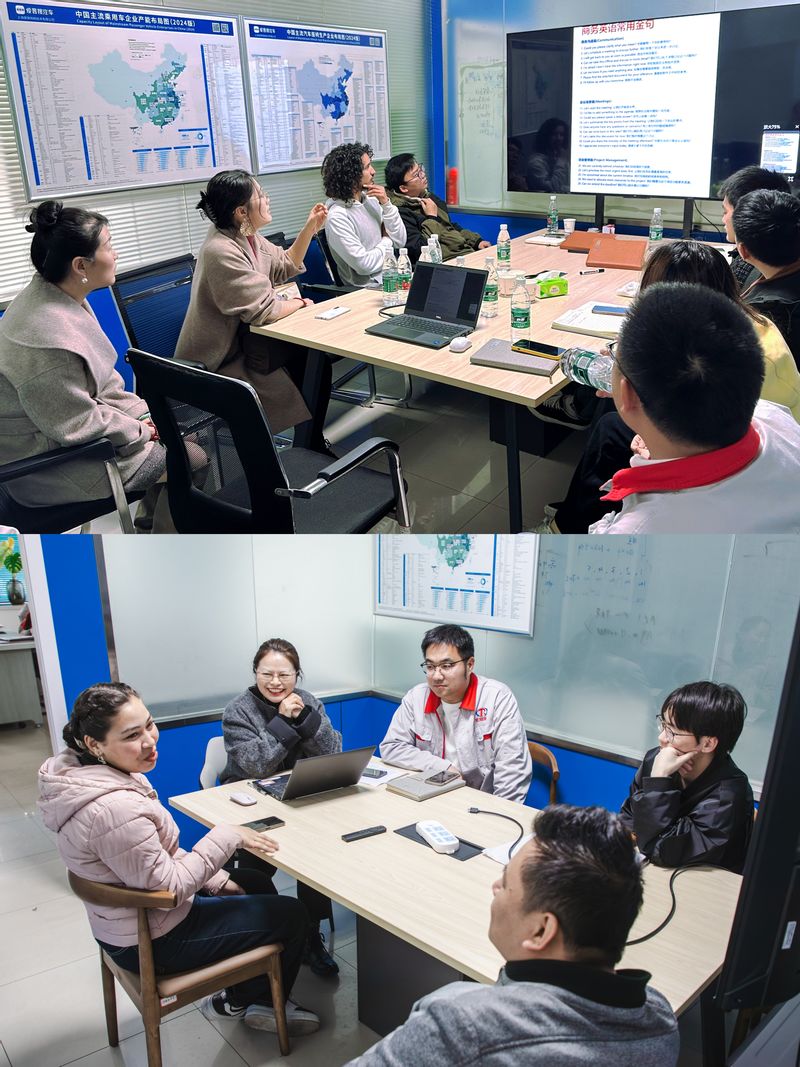活动现场,由外国语学院MTI研究生、国际教育学院机械工程专业部分留学生和瑞泰骨干员工组成的“跨文化交流小组”成为亮点。在分组交流环节,各个小组围绕商务英语的实际应用和跨文化交际等主题开展情景模拟,企业员工在实战演练中提升语言应用能力,留学生则从语言表达和跨文化交流等方面进行了现场指导。在交流环节,韩利敏和涂文婷老师走动于各个小组之间,动态引导活动进程,帮助参与交流的企业员工和留学生更好地融入情景。