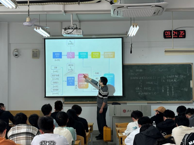 黄博本次讲授内容为《基础工程》桩基础设计部分,课程内容难度大、知识框架体系繁琐。为了提高授课效果,他在讲授完理论知识之后,帮助学生梳理了桩基础设计的流程,梳理知识框架体系,再结合课本例题跟随设计流程逐一介绍各知识点。同时,借助学习通教学平台线上线下结合分享了计算案例的讲解,引导学生在课后有针对性地学习,学生反馈良好。