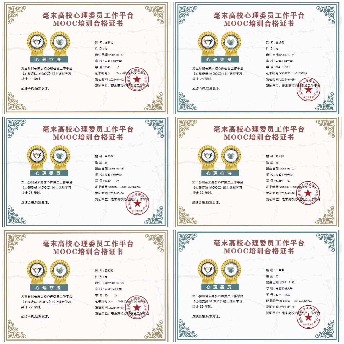 本网讯 4月至5月,心理健康教育中心组织我校心理委员参加全国高校心理委员MOOC和心理疗法MOOC培训。经过系统学习与考核,322位同学通过心理疗法MOOC培训,319位同学通过心理委员MOOC培训,并获得由中国心理学会颁发的合格证书。