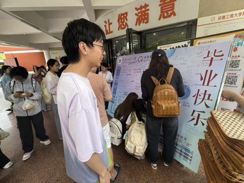 第二食堂准备了水果和毕业礼物,免费送给即将毕业的大学生,让毕业生在离校后不只是记得食堂的味道,还有暖心关怀和真诚祝福。第三食堂、第四食堂为毕业生送上了饮料、水果、书签、文创编织袋等毕业礼物,还设立了毕业签名墙和祝福留言板,毕业生参与热情高,纷纷签名打卡留念,同时写下对母校的祝福和对未来的憧憬。