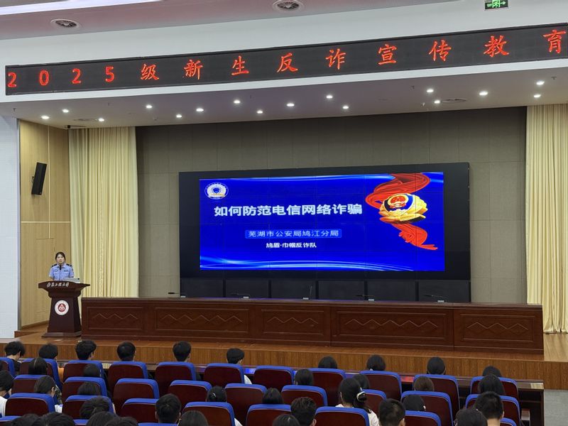 本网讯 为切实增强2025级学生防范电信网络诈骗的意识,提升校园安全水平,916日,人工智能学院联合校安全管理处在图书馆5楼报告厅举办“智院防诈 安全领航”防诈骗安全教育专题讲座。本次讲座特邀芜湖市公安局鸠江分局鸠盾·巾帼反诈队郭静微警官主讲,校安全管理处相关人员、新生辅导员以及全体新生参加活动。