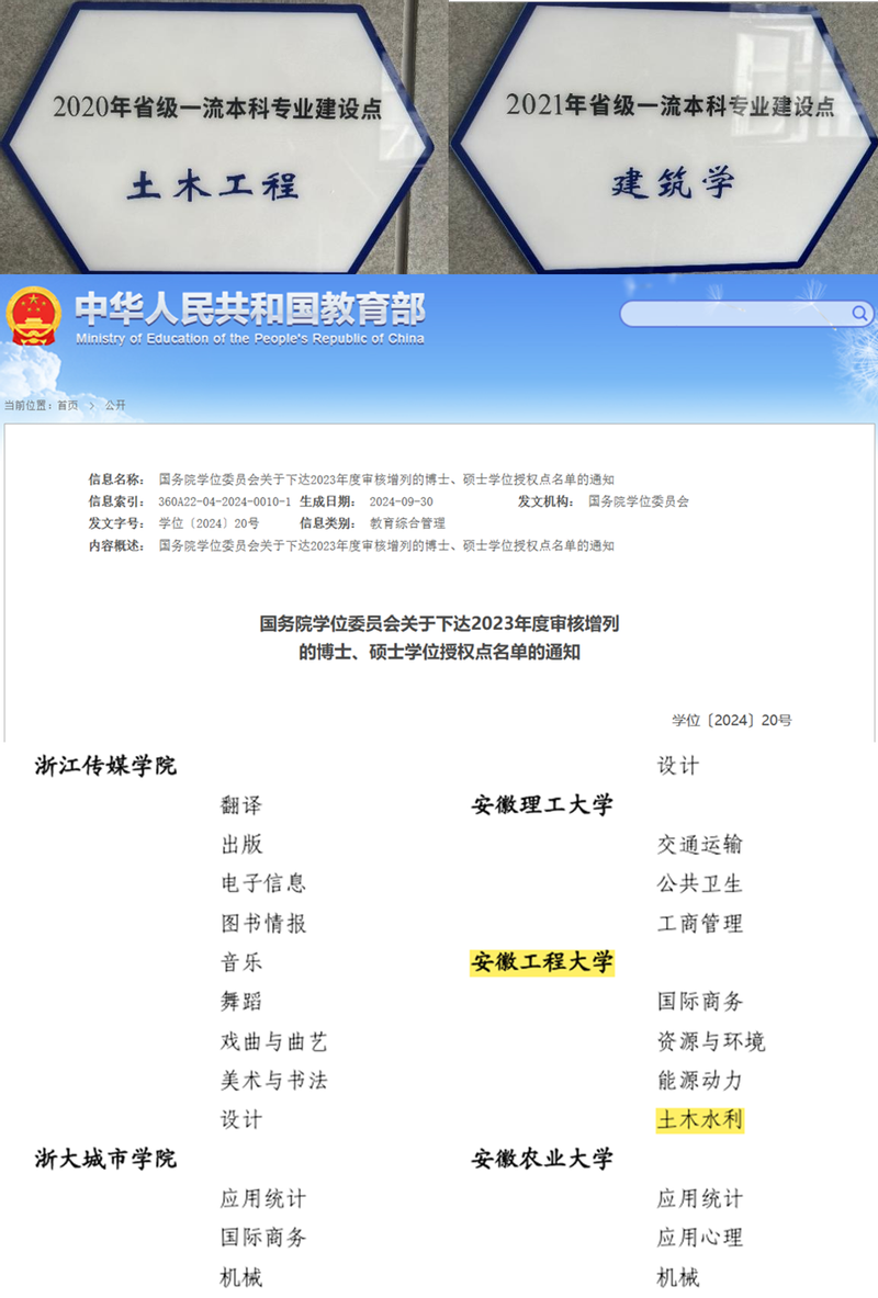 学院明确专业办学目标,紧密对接国家发展战略和区域经济社会发展需求,对标国家一流专业建设目标,制定科学合理的专业建设规划。围绕“新的工科专业,工科专业的新要求,交叉融合再出新”的理念,不断深化新工科建设,优化专业结构,加强产学研对接,提升专业内涵。3个招生专业中均服务于安徽省十大新兴产业,为市场人才需求提供了坚实支撑。引入行业前沿技术和课程,提升学生的实践能力和创新能力。目前,学院土木工程、建筑学专业获批省级一流本科专业建设点,给排水科学与工程通过教育部专业评估认证,土木工程专业通过教育部专业评估认证自评报告。