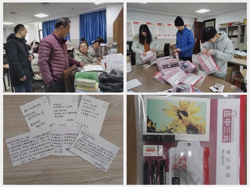 大一新生们在明信片上写祝福语,给学长学姐们加油。王传玉关心询问他们的复习状态。他说,“宝剑锋从磨砺出,梅花香自苦寒来”,鼓励他们坚持到最后,完成每天的学习计划,但也要放平心态,切勿压力过大,从容面对。刘伟鼓励同学们坚持再坚持,以最佳的状态迎接研究生招生考试。