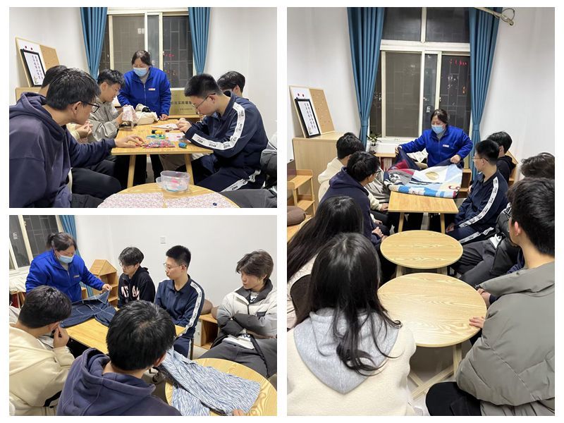 小课堂现场,大家最先开始学习的是缝补技能,包括穿针引线、交叉与正方形缝法、打线尾结、锁针利落,这些步骤缺一不可。同学们跃跃欲试,在宿管阿姨逐一的耐心指导与解答下,现场气氛融洽活跃,学习成果也令人欣喜。紧接着,宿管阿姨向大家讲授了叠衣服的一些简单叠法与整齐叠法,同学们纷纷尝试,受益匪浅。宿管阿姨还向大家演示了一些授叠被子的技巧,同学们轮流进行实践。
