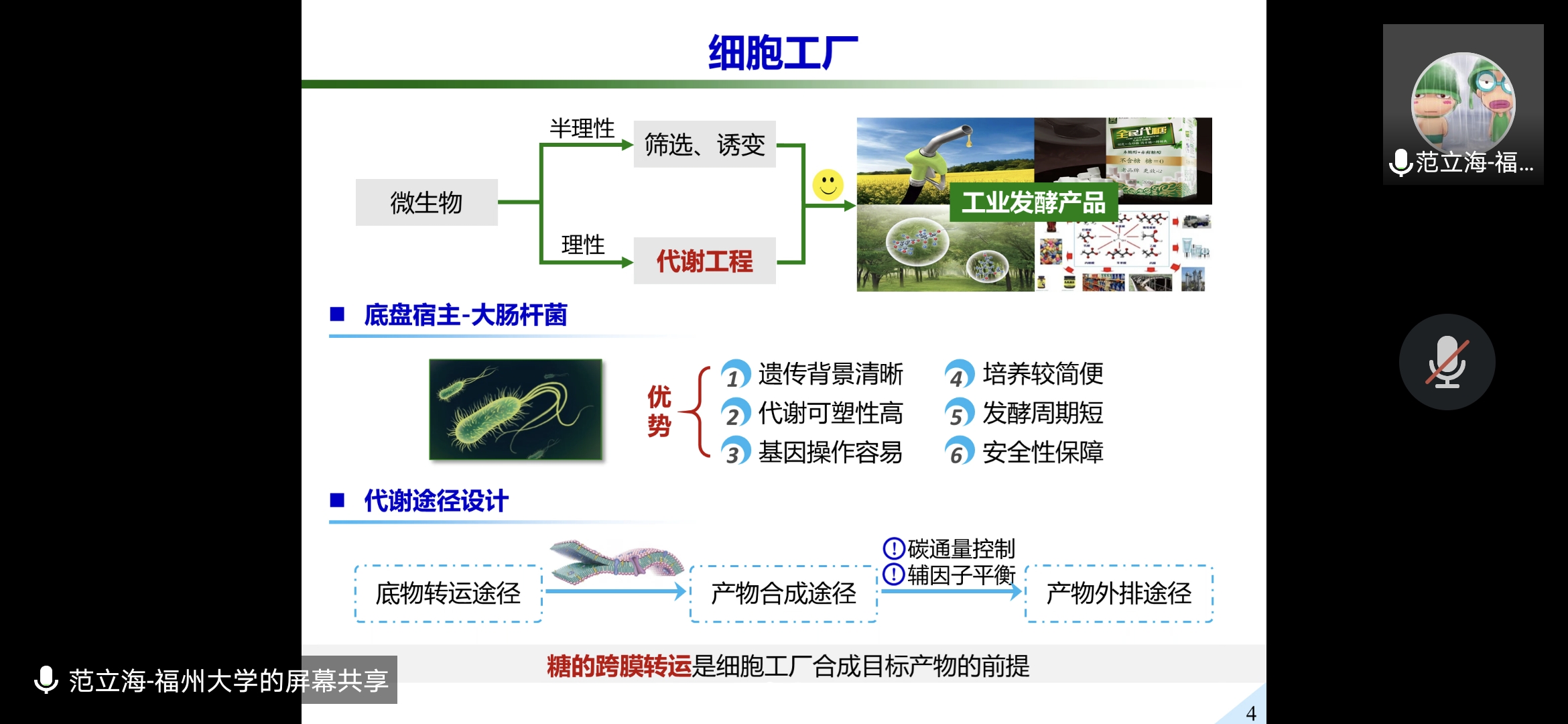 范立海教授报告是针对大肠杆菌的特异性糖转运途径存在底物范围狭窄、“饱和现象”、“抑制物敏感”和“诱导物排斥”等问题,设计了由SecY通道和SCVE外膜致孔蛋白组成的简单扩散跨膜系统,实现葡萄糖、果糖、木糖和阿拉伯糖等的非特异性跨内膜运输,并将该系统应用于木糖醇和D-阿洛酮糖的生物合成,实现木糖醇细胞工厂的碳代谢流自动控制和D-阿洛酮糖细胞工厂的底物非磷酸化转运。此外,基于氨基酸孔环的定点突变,进一步开发SecY通道的二糖转运功能。
